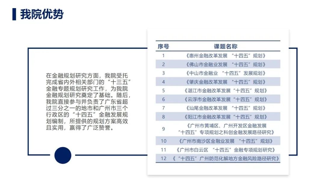 广东南方金融创新研究院自成立以来,长期深耕金融规划研究,先后受托完成省内外相关部门的“十三五”金融专题规划研究工作和中期评估工作,持续积累研究经验。2019-2021年,研究院直接参与并负责了广东省超过1/3地市和广州市三个行政区的“十四五”金融发展规划编制工作,所提供的规划方案高效且实用,赢得了广泛赞誉。为此,研究院推出《“十五五”金融规划研究服务方案》,面向各级政府相关部门、机构提供规划研究服务,欢迎来电咨询。(“十五五”金融规划咨询专线:020-89993197,13427644255)